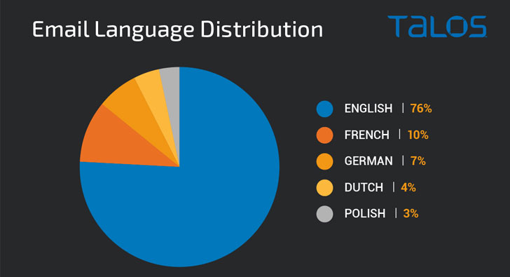 What’s more, the language employed in the reply messages matches the language used in the original email thread, demonstrating a case of dynamic localization put in place to increase the likelihood of success of the campaign. The top five languages used to deliver the loader are English (76%), followed by French (10%), German (7%), Dutch (4%), and Polish (3%).